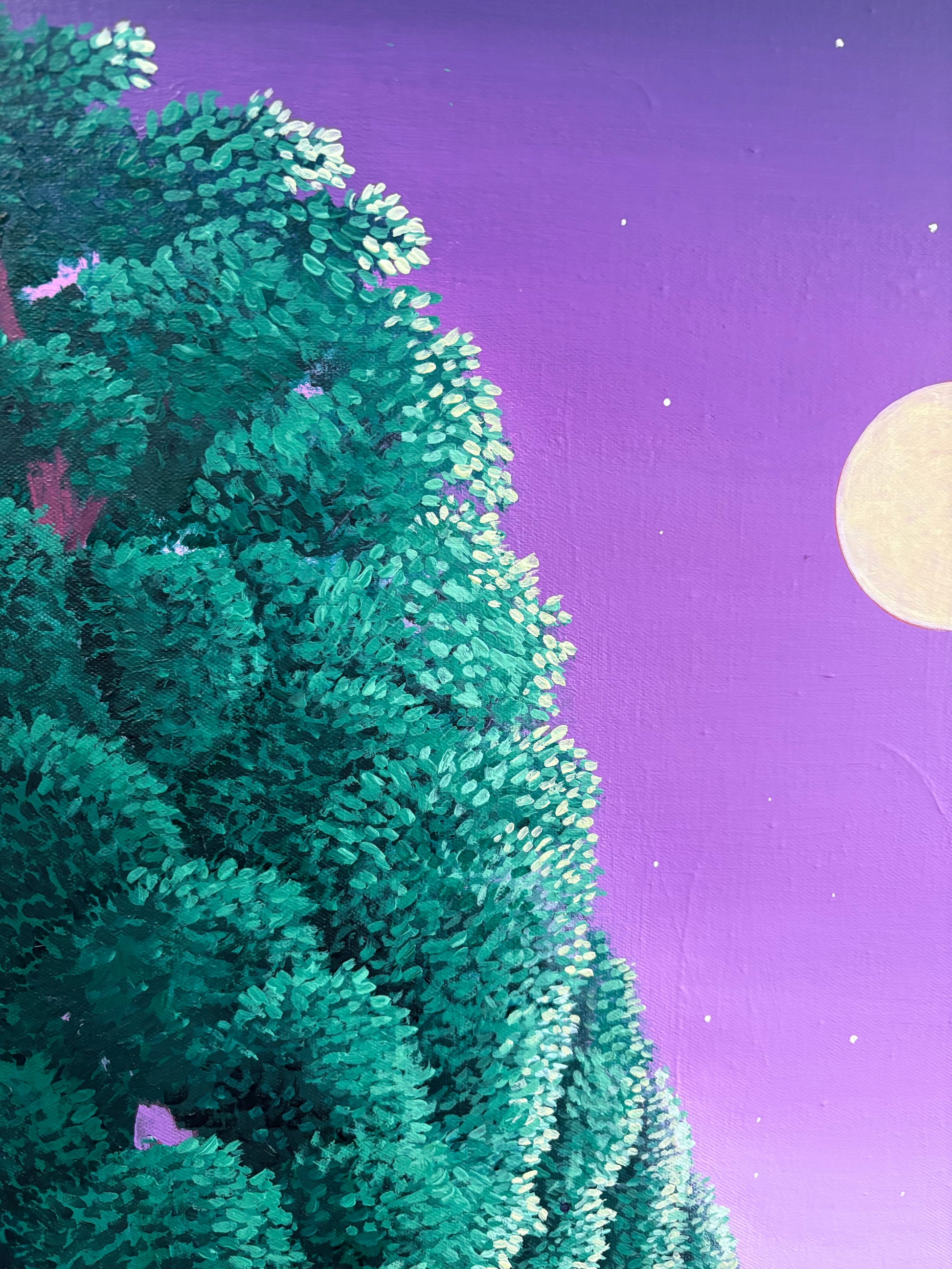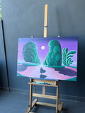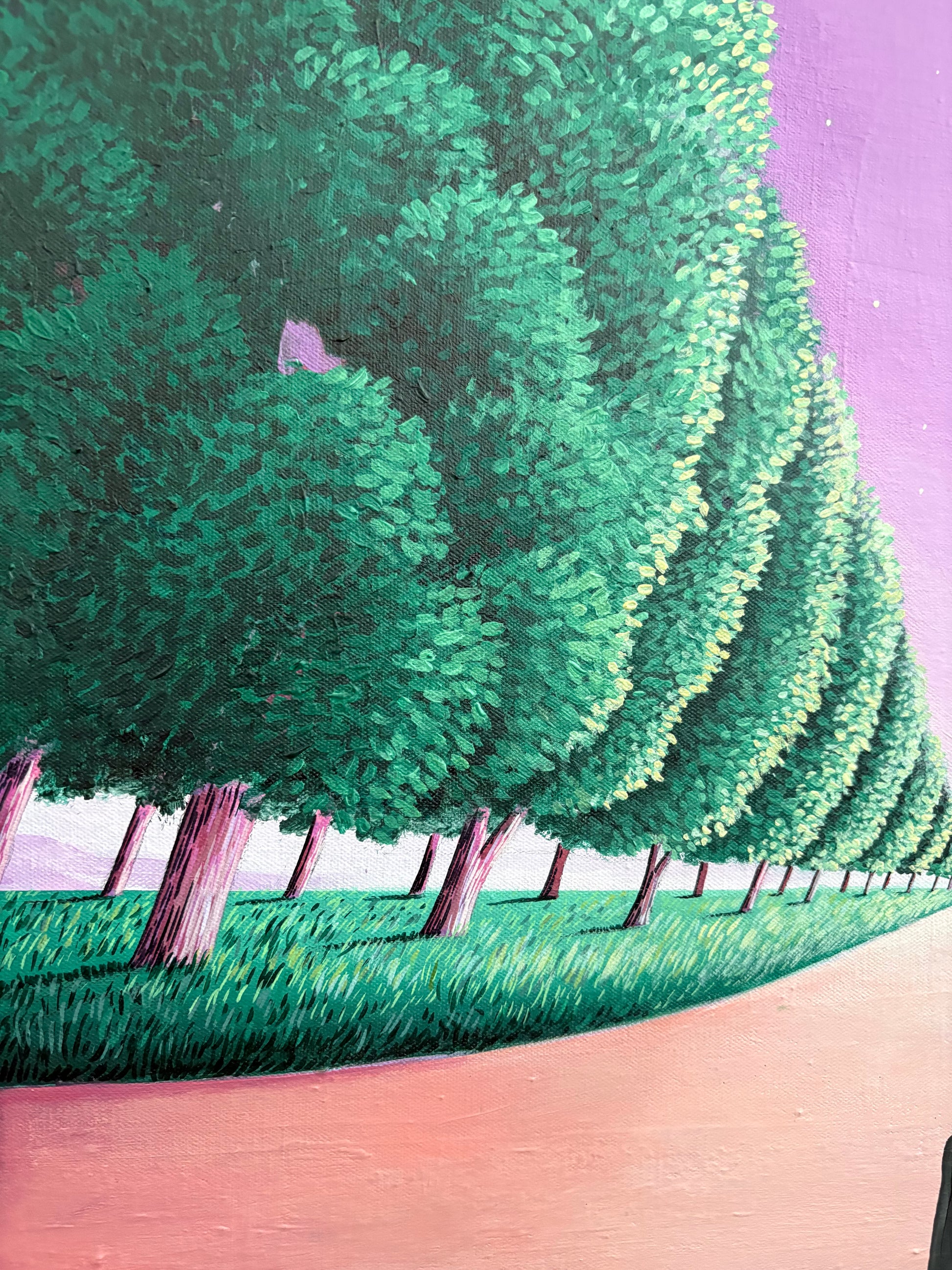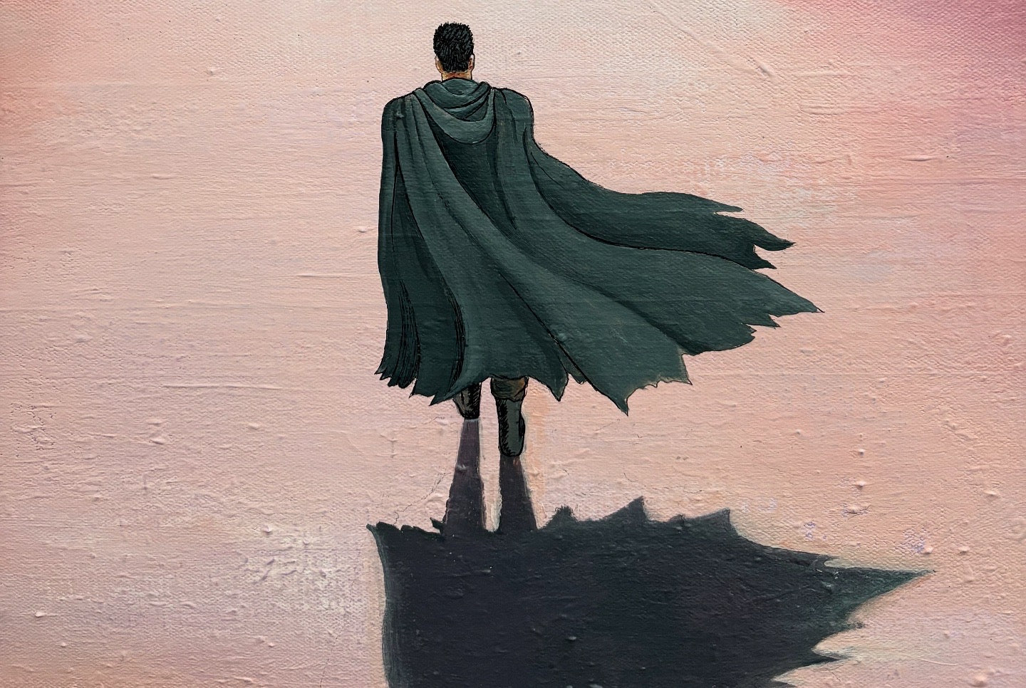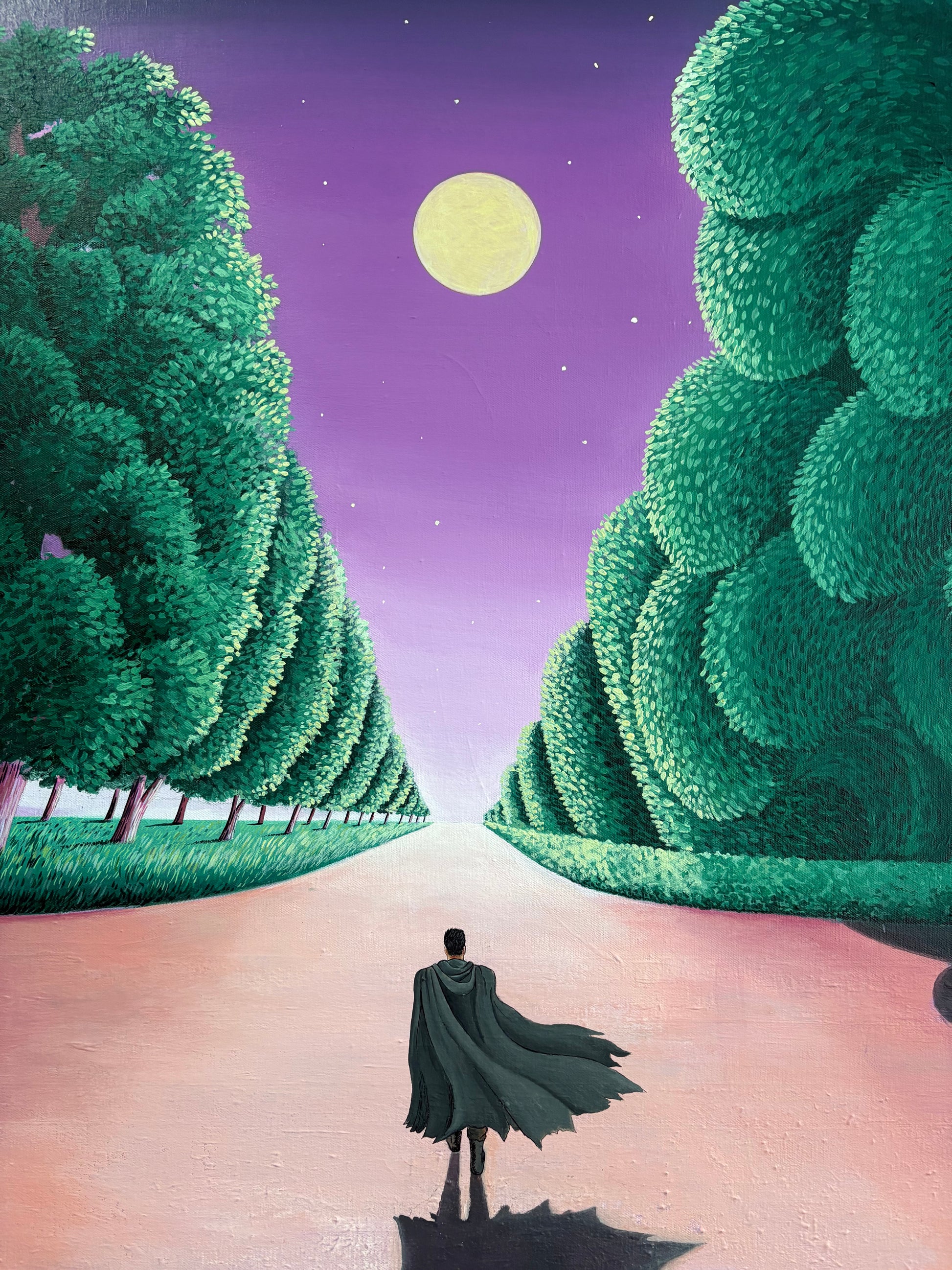 ‘The Hero’s Journey’ explores the silent moment before transformation, the pause between who we were and who we’re becoming. Under a violet sky, the traveller faces the unknown, guided only by his own shadow and the light ahead